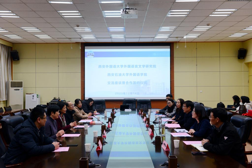 我校外國語學院黨委書記田虹霞介紹了學院的基本情況,著重就學院近年來的教學科研、師資隊伍、人才培養(yǎng)、社會服務等情況進行交流。西安外國語大學外國語言文學研究院院長黃立波介紹了研究院基本情況及近3年取得的重要學術成果。雙方代表圍繞教育教學、科學研究、人才培養(yǎng)等方面的合作展開熱烈討論與交流。