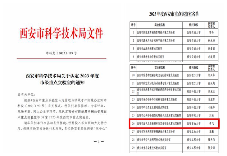 近日,西安市科技局發(fā)布《西安市科學(xué)技術(shù)局關(guān)于認(rèn)定2023年度市級(jí)重點(diǎn)實(shí)驗(yàn)室的通知》,我校電子工程學(xué)院李飛教授牽頭的“西安市油氣及新能源開發(fā)裝備智能化重點(diǎn)實(shí)驗(yàn)室”通過認(rèn)定,本次共38家實(shí)驗(yàn)室通過認(rèn)定。