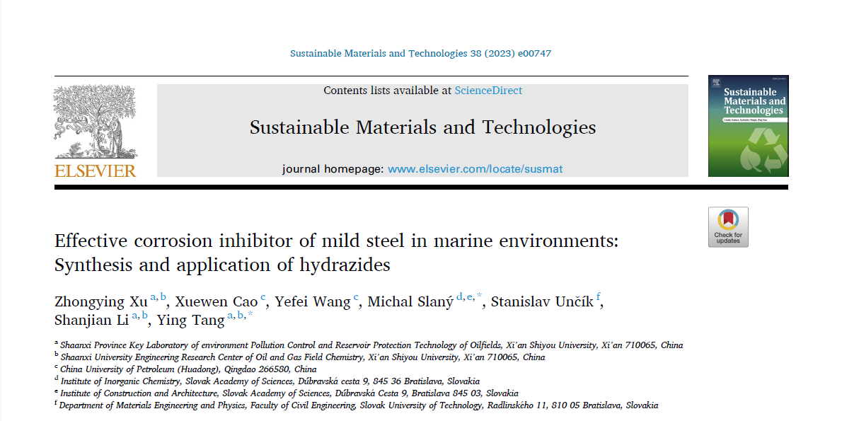 近日,我校與中國石油大學(華東)、斯洛伐克科學院合作在能源環(huán)境領域國際權威學術期刊《Sustainable Materials and Technologies》(IF=9.6)發(fā)表題為《Effective corrosion inhibitor of mild steel in marine environments: Synthesis and application of hydrazides》的論文。