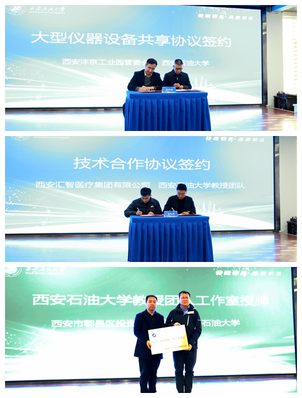 期間,實驗室管理處負責(zé)人代表學(xué)校與灃京工業(yè)園簽訂大型儀器設(shè)備開放共享協(xié)議;化學(xué)化工學(xué)院楊博老師團隊與西安匯智醫(yī)療集團有限公司簽訂技術(shù)合作意向協(xié)議;科技處負責(zé)人代表學(xué)校接受灃京工業(yè)園管委會頒發(fā)的西安石油大學(xué)教授團隊工作室牌匾。