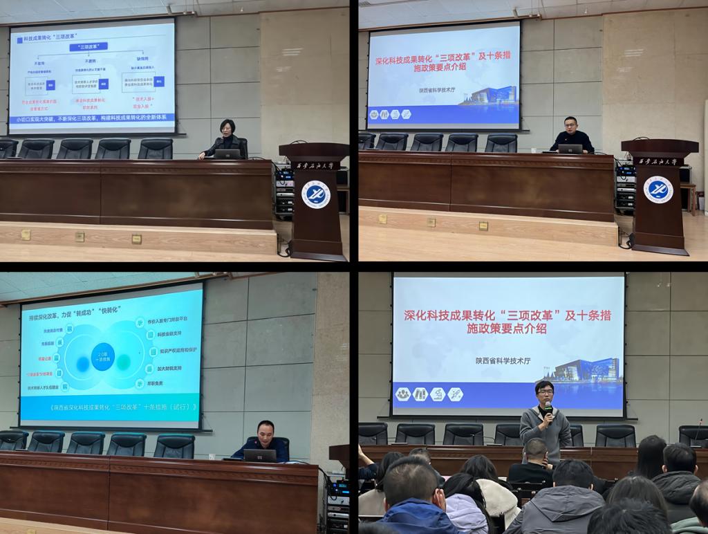11月14日下午,由陜西省科技廳主辦、我校承辦的陜西省科技成果轉(zhuǎn)化“三項(xiàng)改革”宣講會(huì)西安石油大學(xué)專(zhuān)場(chǎng)在雁塔校區(qū)會(huì)議中心第三會(huì)議室舉行?!叭?xiàng)改革”宣講團(tuán)第1組成員來(lái)校進(jìn)行宣講,宣講團(tuán)由省委黨校教授翟曉舟、陜西科技大學(xué)前沿院成果轉(zhuǎn)化部部長(zhǎng)李志如、西安聯(lián)創(chuàng)生物醫(yī)藥孵化器劉海鵬、省科技資源統(tǒng)籌中心科技經(jīng)紀(jì)部副部長(zhǎng)謝飛組成。學(xué)校科技處副處長(zhǎng)孫會(huì)珠主持了會(huì)議。