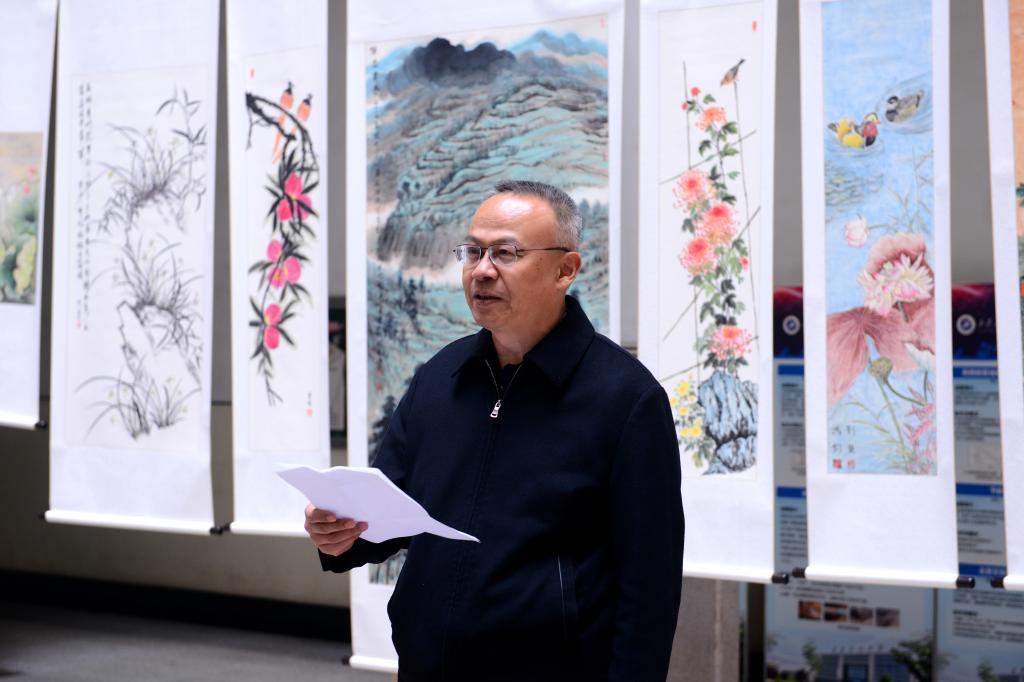 李延平致開幕詞,他首先向這次書畫展的成功舉辦表示衷心祝賀,向參加今天開幕儀式的各位書畫愛好者、各位來賓表示誠摯的歡迎,向參展嘉賓的辛勤創(chuàng)作表示感謝。他講到,中華優(yōu)秀傳統(tǒng)文化是中華民族的文化根脈,也是我們書畫愛好者創(chuàng)作的源泉。我校書畫愛好者秉承這一理念,以傳統(tǒng)筆墨描繪自己的生活,以高超技法歌頌我們的校園,展示出了我校書畫愛好者的風采,讓我們共同感受了中華傳統(tǒng)文化的魅力,體會了視覺的沖擊,享受了色彩的絢麗。