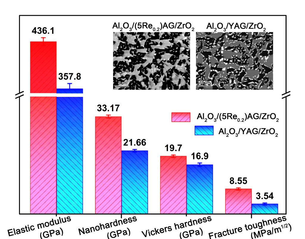 圖1 Al2O3/(5Re0.2)AG/ZrO2和Al2O3/YAG/ZrO2三元共晶復(fù)合材料的形貌和力學(xué)性能比較