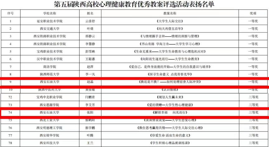 其中,我校學(xué)生工作部(處)(學(xué)生心理成長指導(dǎo)中心)魏曉言老師、焦文潔老師分別榮獲第九屆陜西高校心理健康教育優(yōu)秀咨詢案例一等獎和二等獎,趙晶老師、張陽老師分別榮獲第五屆陜西高校心理健康教育優(yōu)秀教案評選一等獎和三等獎。由計算機學(xué)院姚謙老師和學(xué)生心理成長指導(dǎo)中心魏曉言老師指導(dǎo)的心理情景劇《你完美的剛剛好》、化學(xué)化工學(xué)院秦嶺老師和學(xué)生心理成長指導(dǎo)中心趙晶老師指導(dǎo)的心理情景劇《向陽而生》分別榮獲第五屆陜西高校校園心理情景劇評選活動一等獎和三等獎。由石油工程學(xué)院胡娟、經(jīng)濟管理學(xué)院何欣月和付鈺冉組成的參賽隊伍在第六屆陜西高校大學(xué)生心理健康科普知識競賽中榮獲三等獎,該團隊由魏曉言、惠笑吟老師指導(dǎo)。