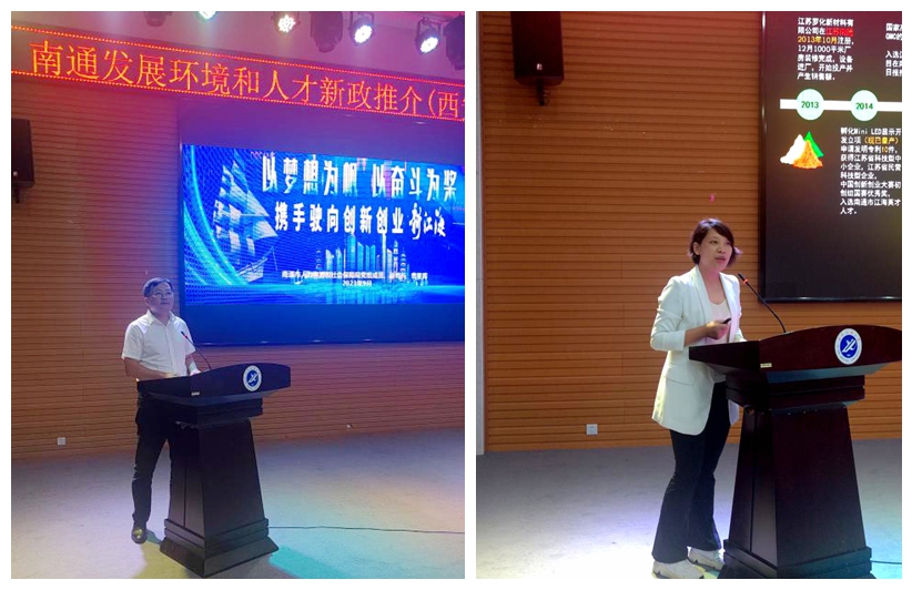 曹星暉代表人力資源和社會(huì)保障局作“南通發(fā)展環(huán)境和人才政策”推介,從產(chǎn)業(yè)提質(zhì)擴(kuò)量、交通樞紐建設(shè)、營商環(huán)境優(yōu)化、城市品質(zhì)提升、生活品質(zhì)提升等方面介紹了南通市經(jīng)濟(jì)發(fā)展情況和人才新政。江蘇羅化新材料有限公司董事長(zhǎng)羅雪方作為企業(yè)代表,結(jié)合自身創(chuàng)業(yè)經(jīng)歷分享了南通市優(yōu)質(zhì)的創(chuàng)業(yè)環(huán)境和引才留才舉措。