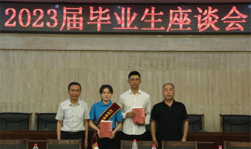 座談會后,張木和陳軍斌代表學校向畢業(yè)生代表贈送了書籍。
