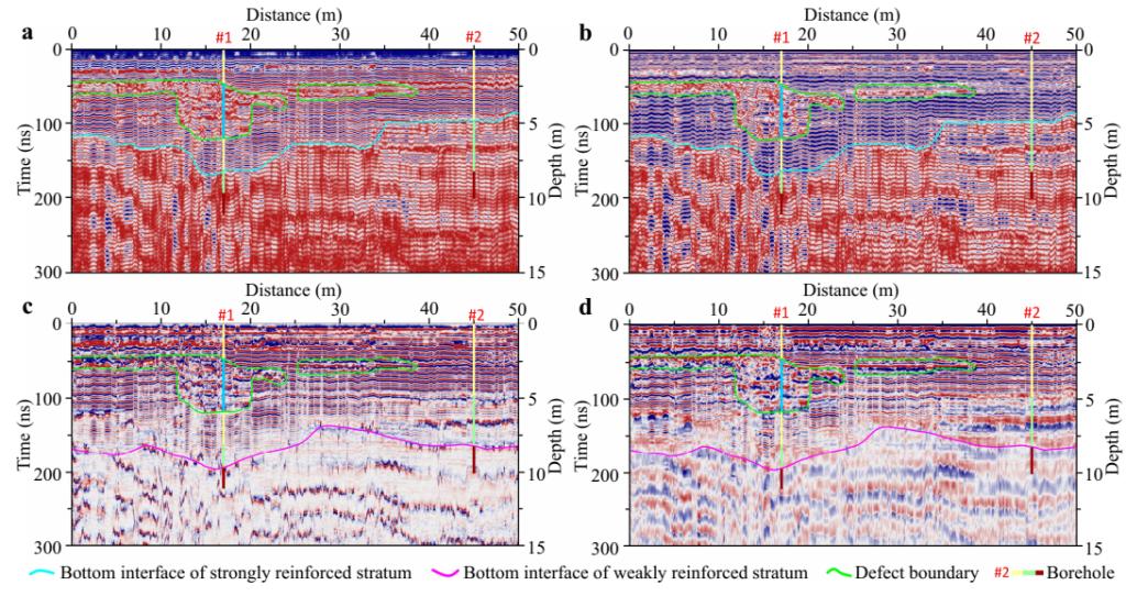 針對(duì)上述困難和挑戰(zhàn),研究團(tuán)隊(duì)歷時(shí)數(shù)年研究,通過理論推導(dǎo)、模型構(gòu)建、數(shù)值模擬、軟件開發(fā)和現(xiàn)場(chǎng)試驗(yàn)等手段,創(chuàng)新提出了將樁基缺陷檢測(cè)轉(zhuǎn)化為地基加固質(zhì)量評(píng)價(jià)的思想,構(gòu)建出樁群加固地基的地質(zhì)模型,揭示了群樁條件下地基的地質(zhì)雷達(dá)(Ground Penetrating Radar,GPR)響應(yīng)特征,研發(fā)出GPR多屬性信息提取軟件新技術(shù),并建立了樁基缺陷檢測(cè)及地基加固質(zhì)量評(píng)價(jià)的GPR技術(shù)體系。依托甘肅省安臨高速公路建設(shè)項(xiàng)目,研究團(tuán)隊(duì)開展了GPR技術(shù)在DCM樁缺陷檢測(cè)及地基加固質(zhì)量評(píng)價(jià)中的應(yīng)用實(shí)踐。研究結(jié)果表明,通過融合單道波形、多道剖面、GPR屬性和鉆孔等信息,可準(zhǔn)確識(shí)別出樁長(zhǎng)和強(qiáng)/弱加固層、原生地層、缺陷地層的埋深及范圍等。該研究成果為軟土地基的DCM樁加固質(zhì)量評(píng)價(jià)提供了一種快速、高效和經(jīng)濟(jì)的技術(shù)解決方案,填補(bǔ)了樁群數(shù)量大、樁距小、密度高等情況下樁基缺陷高效檢測(cè)的技術(shù)空白。