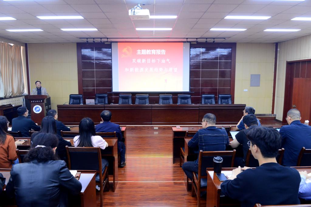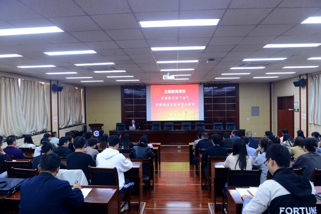 李天太在講授中強(qiáng)調(diào)了本次學(xué)習(xí)貫徹習(xí)近平新時(shí)代中國(guó)特色社會(huì)主義思想主題教育的總要求、根本任務(wù)、5個(gè)目標(biāo)、著力解決6個(gè)方面突出問題,并從雙碳新目標(biāo)、世界油氣發(fā)展趨勢(shì)、我國(guó)油氣發(fā)展趨勢(shì)、石油天然氣勘探開發(fā)關(guān)鍵技術(shù)和新能源發(fā)展展望五個(gè)方面出發(fā),指出當(dāng)前我國(guó)正處于實(shí)現(xiàn)“雙碳”目標(biāo)、構(gòu)建“清潔低碳、安全高效”能源體系的關(guān)鍵時(shí)期,做好“碳達(dá)峰、碳中和”工作要加快調(diào)整優(yōu)化產(chǎn)業(yè)結(jié)構(gòu)、能源結(jié)構(gòu)。我校作為以石油石化為特色的多科性普通高等學(xué)校,要深刻把握新能源技術(shù)發(fā)展水平與趨勢(shì),始終推進(jìn)學(xué)校向高水平教學(xué)研究型大學(xué)邁進(jìn),持續(xù)強(qiáng)化和拓展學(xué)校優(yōu)勢(shì)學(xué)科領(lǐng)域、落實(shí)“雙一流”建設(shè),堅(jiān)持立德樹人根本任務(wù),堅(jiān)持科技創(chuàng)新“四個(gè)面向”,著力培養(yǎng)“三和”+“三碳”人才,服務(wù)于國(guó)家能源建設(shè)。