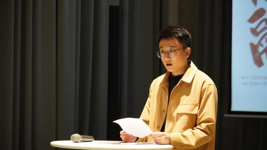 人文學(xué)院2023屆藝術(shù)碩士研究生畢中澤作為學(xué)生代表發(fā)言。他首先代表17位即將畢業(yè)的研究生感謝學(xué)校領(lǐng)導(dǎo)和相關(guān)職能部門提供的展示平臺(tái),本次展覽是同學(xué)們在深入學(xué)習(xí)中國傳統(tǒng)文化、關(guān)注現(xiàn)實(shí)生活、探尋藝術(shù)規(guī)律的基礎(chǔ)上,將藝術(shù)與技術(shù)融合思考轉(zhuǎn)化為設(shè)計(jì)實(shí)踐的一次綜合嘗試,反映出同學(xué)們時(shí)刻關(guān)注社會(huì)、服務(wù)社會(huì)的創(chuàng)作初心。