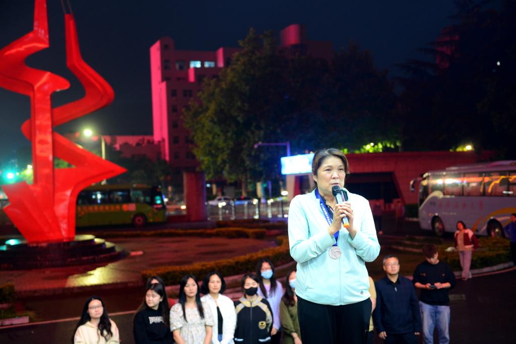 主教練秦香代表球隊(duì)教練組發(fā)言。她表示,對(duì)學(xué)校組織的歡迎儀式感到無(wú)比榮耀,對(duì)多年來(lái)給予籃球隊(duì)大力支持的各級(jí)領(lǐng)導(dǎo)和部門表示感謝。她回憶起多年執(zhí)教之路,感慨萬(wàn)千,泣不成聲,同時(shí)希望隊(duì)員們?cè)俳釉賲?,更加進(jìn)步。隨后秦香為李天太、張木、陳軍斌三位校領(lǐng)導(dǎo)贈(zèng)送本屆比賽季軍獎(jiǎng)牌。
