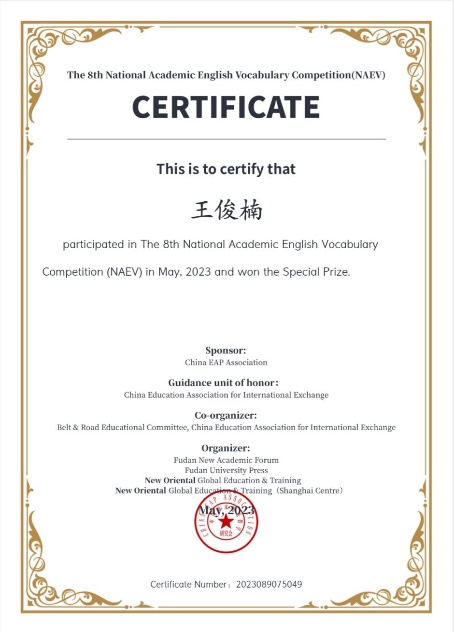 外國語學院組織我校1172名學生參賽(本科生1032人,研究生140人)。經(jīng)過三輪比拼,我校學生王俊楠從一萬七千名參賽者中脫穎而出,獲全國特等獎,摘得“學術英語詞匯之星”!這是外國語學院自2021年組織我校學生參加該競賽以來的重大突破!