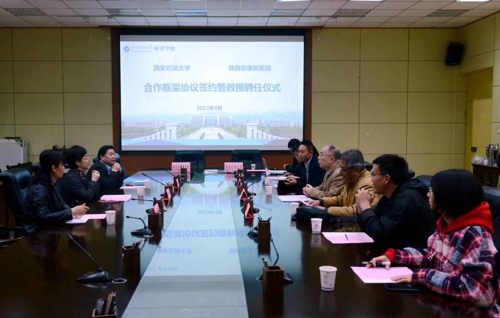 陳軍斌代表學(xué)校對(duì)石秀娥一行的到來(lái)表示歡迎,對(duì)陜西省康復(fù)醫(yī)院多年來(lái)給予我校的大力支持表示感謝。他講到,兩家單位地理位置相近,合作歷史久遠(yuǎn),我校近年來(lái)在體育和康復(fù)領(lǐng)域發(fā)展較為迅速,前期體育學(xué)院與陜西省康復(fù)醫(yī)院合作建立研究生聯(lián)合培養(yǎng)基地是雙方合作的開(kāi)端,希望本次簽署合作框架協(xié)議后,能夠在更廣泛的領(lǐng)域內(nèi)、更深度的層次上進(jìn)行合作,從而達(dá)到互利共贏的效果。