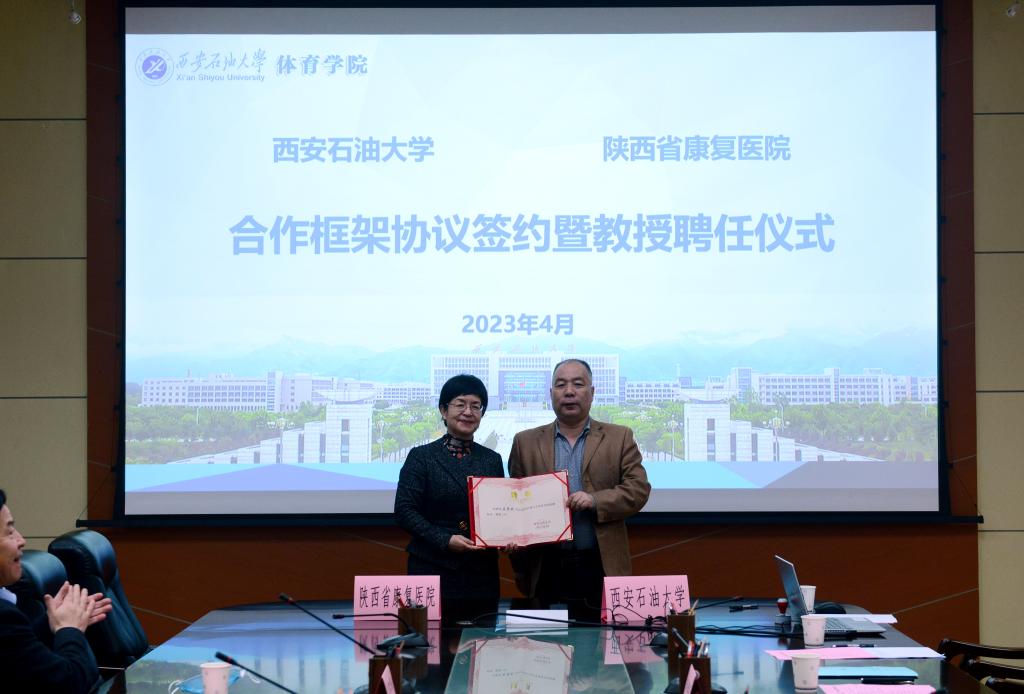 會(huì)上,陳軍斌代表學(xué)校向陜西省康復(fù)醫(yī)院研究生聯(lián)合培養(yǎng)基地授牌,并向石秀娥頒發(fā)特聘教授聘書(shū)。