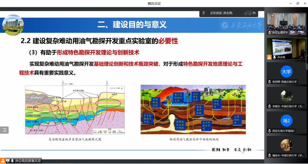 12月4日,受教育部科技與信息化司委托,陜西省教育廳組織9名專家對我校“復雜難動用油氣勘探開發(fā)”教育部重點實驗室的建設計劃進行了可行性論證,會議采取“線上+線下”相結合的形式召開。省教育廳副廳長高嶺、科技處處長朱曉冬;我校黨委書記賽云秀,實驗室主任、校長李天太,副校長李華、程永清、張榮軍,總會計師樊曉民,實驗室學術帶頭人、學術骨干以及學校相關單位負責人參加了會議。會議由朱曉冬主持。