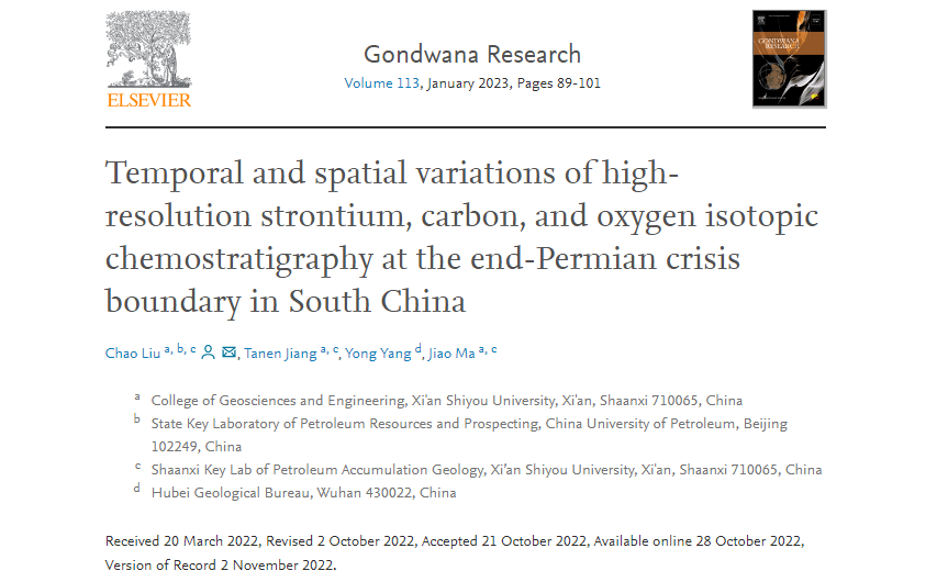近日,我校地球科學(xué)與工程學(xué)院教師劉超在國際地學(xué)頂級(jí)期刊Gondwana Research在線發(fā)表了題為“Temporal and spatial variations of high-resolution strontium, carbon, and oxygen isotopic chemostratigraphy at the end-Permian crisis boundary in South China”的學(xué)術(shù)論文,探討了二疊系/三疊系之交生物大滅絕的相關(guān)重要科學(xué)問題。