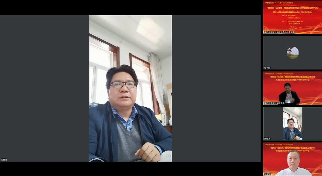 張金高代表省社科聯(lián)對會議的召開表示祝賀,他充分肯定了陜西省改革發(fā)展研究會作為省優(yōu)秀學術(shù)社團在推動社科研究方面的作用,省改革發(fā)展研究會緊扣黨的二十大精神,充分發(fā)揮理論研究優(yōu)勢、人才資源優(yōu)勢,以“增強消費對陜西經(jīng)濟發(fā)展的基礎性作用”為主題,精心組織專家研究闡釋黨的二十大精神,爭當學習宣傳貫徹黨的二十大精神的先行者、模范者,為奮力推進黨的二十大精神貢獻社科力量,具有重要的學術(shù)價值和現(xiàn)實意義。學習宣傳貫徹黨的二十大精神,是當前和今后一個時期社科界的首要政治任務,張金高鼓勵社科組織和廣大社科工作者都應充分認識黨的二十大的重大意義,鼓勵社科組織采取多種形式,營造濃厚氛圍,掀起黨的二十大精神的學習宣傳貫徹熱潮。