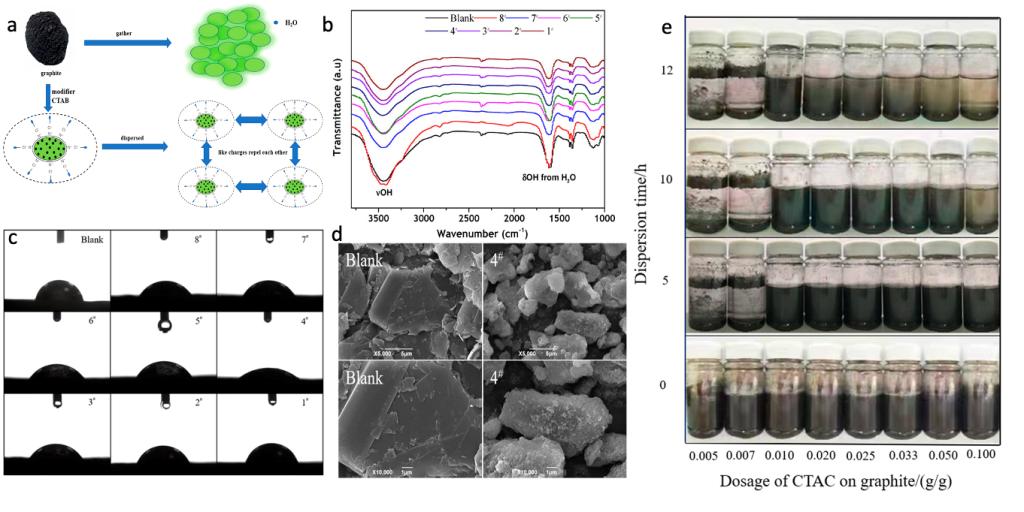 水基膨潤土鉆井液中的粘土在高溫下易發(fā)生聚結、表面鈍化等作用,超高溫還會導致處理劑降解或者分解,削弱甚至消除處理劑在粘土表面的吸附作用,致使鉆井液抗溫性差,因此,超高溫鉆井液技術是實現(xiàn)深層超深層鉆井的關鍵技術之一。該課題組針對高溫鉆井液的技術需求開展研究工作。采用表面活性劑改性石墨制備高度分散的滑潤劑,如圖1所示。由于石墨表面改性后出現(xiàn)擴散雙電層,使得石墨在水中和水基鉆井液中表現(xiàn)出強分散性。在180℃下,添加改性石墨可降低泥餅粘滯系數(shù)67%(Materials2022,15,1083. https://doi.org/10.3390/ma15031083)