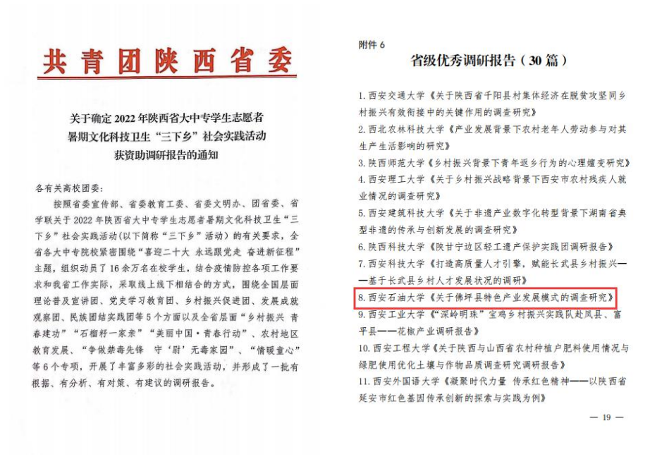 近日,由陜西省委宣傳部、省委文明辦、省委教育工委、團省委、省學聯(lián)等單位聯(lián)合組織開展的“2022年陜西省大中專學生志愿者暑期文化科技衛(wèi)生‘三下鄉(xiāng)’社會實踐活動”評選表彰結(jié)果揭曉,我校榮獲2022年“三下鄉(xiāng)”活動省級優(yōu)秀組織單位,地球科學與工程學院“十心石意援鄉(xiāng)助農(nóng)”社會實踐隊,電子工程學院“曦禾下鄉(xiāng)”社會實踐隊被評為省級優(yōu)秀團隊。王瑩、李政被評為省級先進個人。地球科學與工程學院《關于佛坪縣特色產(chǎn)業(yè)發(fā)展模式的調(diào)查研究》調(diào)研報告獲團省委專項資助。