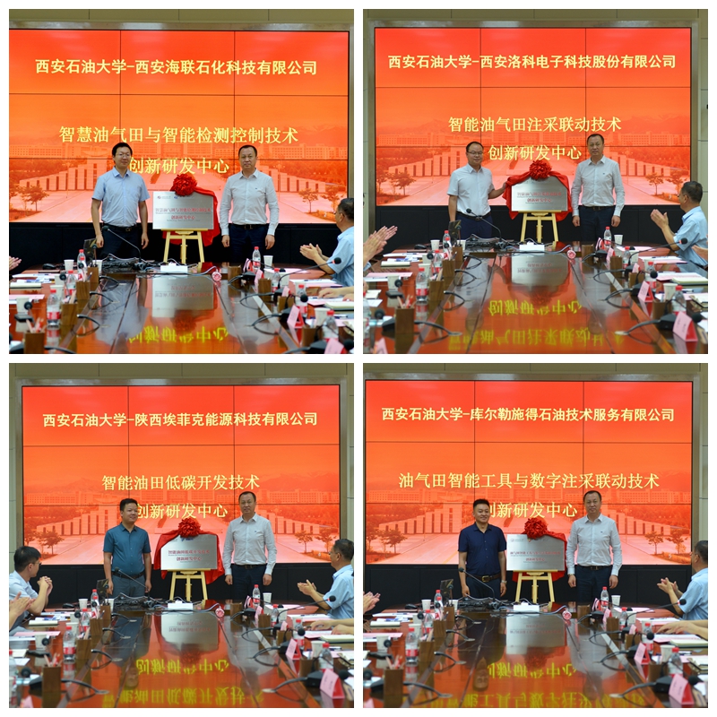 張榮軍代表西安石油大學(xué)分別與四家企業(yè)的總經(jīng)理為西安石油大學(xué)與四家公司的“智慧油氣田與智能檢測(cè)控制技術(shù)創(chuàng)新研發(fā)中心”“智能油氣田注采聯(lián)動(dòng)技術(shù)創(chuàng)新研發(fā)中心”“智能油田低碳開(kāi)發(fā)技術(shù)創(chuàng)新研發(fā)中心”“油氣田智能工具與數(shù)字注采聯(lián)動(dòng)技術(shù)創(chuàng)新研發(fā)中心”進(jìn)行揭牌,正式開(kāi)啟與四家公司的產(chǎn)學(xué)研合作。學(xué)校還與四家企業(yè)還簽訂了“研究生聯(lián)合培養(yǎng)基地”。