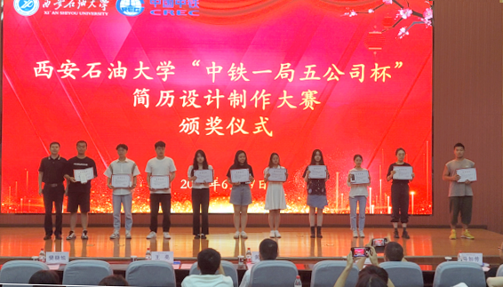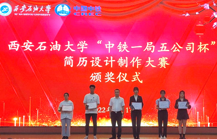 黃曉春宣讀了“中鐵一局五公司杯”簡歷設(shè)計制作大賽表彰決定,并為謝仁阿依等5名同學頒發(fā)了“設(shè)計之星”獎。相關(guān)部門負責人為獲獎單位和個人頒發(fā)了優(yōu)秀組織獎、優(yōu)秀指導教師獎、最佳創(chuàng)意獎和優(yōu)秀獎。