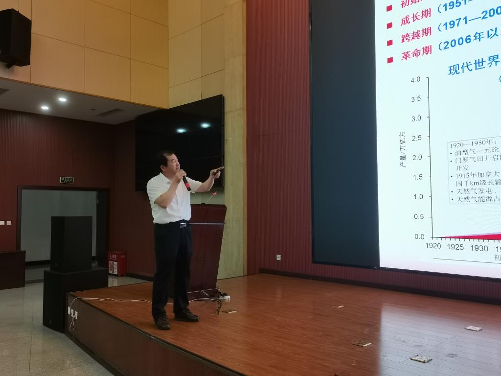 在授課中,李天太首先圍繞習(xí)近平總書記對(duì)國家能源安全作出的批示指示精神、國家“雙碳“目標(biāo)和世界能源格局等方面,向在場(chǎng)師生介紹了學(xué)校成立新能源學(xué)院、土木工程學(xué)院的背景以及必要性。隨后分別介紹了世界油氣發(fā)展趨勢(shì)和我國油氣發(fā)展趨勢(shì)。他以人類社會(huì)發(fā)展為主線,以能源科技革命為人類社會(huì)發(fā)展提供不竭新動(dòng)力為切入點(diǎn),通過詳實(shí)的數(shù)據(jù)和大量的圖表詳細(xì)闡述了世界油氣發(fā)展趨勢(shì)和我國油氣發(fā)展趨勢(shì),強(qiáng)調(diào)在我國目前能源戰(zhàn)略和結(jié)構(gòu)體系下,新能源將發(fā)揮保障國家能源戰(zhàn)略“接替”與“主力”作用。最后,李天太結(jié)合自己30余年能源行業(yè)工作學(xué)習(xí)感悟,對(duì)新能源發(fā)展趨勢(shì)作出展望。他希望新能源學(xué)院、土木工程學(xué)院的廣大學(xué)子樹立遠(yuǎn)大理想,努力學(xué)習(xí)、不負(fù)韶華,爭取為保障國家能源戰(zhàn)略安全作出貢獻(xiàn)。