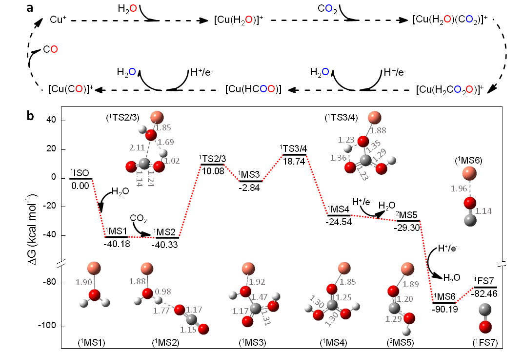 按照傳統(tǒng)觀點,二氧化碳還原轉(zhuǎn)化為一氧化碳中的O原子來自二氧化碳。該研究中,科研人員發(fā)現(xiàn)還原反應生成一氧化碳中的O原子來自反應體系催化劑表面的配位水分子,而非二氧化碳本身。該結(jié)論不僅適用于質(zhì)在線反應過程,也適用于實際二氧化碳的電催化還原反應和工業(yè)化水煤氣逆反應過程,說明該發(fā)現(xiàn)具有一定的普適性。同時發(fā)現(xiàn)相比于金屬催化劑Cu+,當[Cu(H2O)]+作為催化劑時,二氧化碳還原為一氧化碳的反應效率可提高兩個數(shù)量級。為了深入探究該反應過程,科研人員通過改造質(zhì)譜儀對反應中間體的捕獲、同位素對比實驗和密度泛函理論的計算,詳細闡述了二氧化碳在[Cu(H2O)]+催化作用下生成一氧化碳的機制。該工作不僅為深入闡述二氧化碳還原機理提供了方法學基礎(chǔ),也為詳細了解水在二氧化碳還原過程中的作用提供了著眼點。
