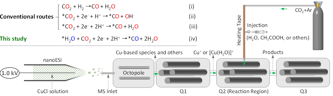 近日,我校化學化工學院張智平教授團隊在二氧化碳還原反應機理研究方面取得了重要進展,相關(guān)工作發(fā)表在《自然-通訊》(Nat. Commun.2022, 13, 2577)。本工作中,研究人員通過對商品儀器的改造,巧妙地將三重四極質(zhì)譜儀第一級四極桿作為特定催化劑離子的實時分離器、第二級四極桿作為二氧化碳還原過程的微反應器、第三級四極桿將反應涉及的中間體和產(chǎn)物在線傳遞到檢測器中,采用同位素標記化合物作為反應的示蹤劑,通過對質(zhì)譜儀氣路系統(tǒng)的特殊設(shè)計,直接將常壓電離源電離的催化劑銅離子及其配合物離子分離出來與二氧化碳氣體在線相互作用,通過對各種實驗條件下反應中間體及產(chǎn)物的在線捕獲及同位素對比實驗,詳細闡釋了二氧化碳還原為一氧化碳的反應機理。
