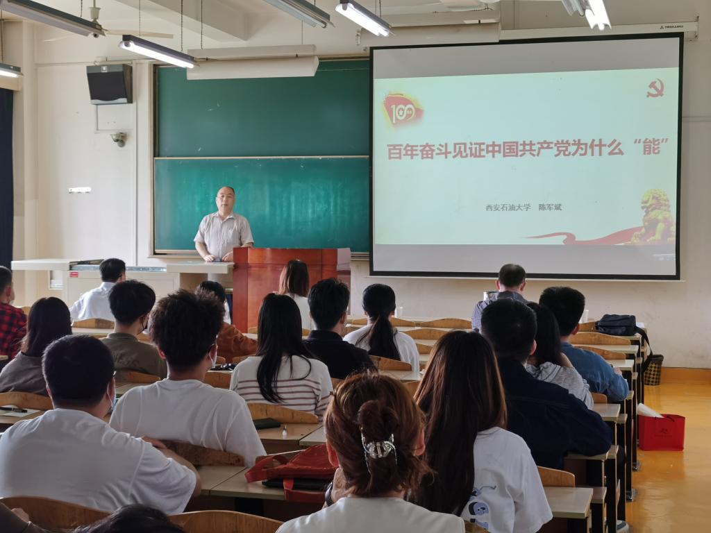 為深入貫徹全國(guó)高校思想政治工作會(huì)議精神和上級(jí)文件精神,切實(shí)增強(qiáng)學(xué)校思想政治教育實(shí)效,5月10日下午,副校長(zhǎng)陳軍斌在雁塔校區(qū)東方石油樓1111教室為理學(xué)院師生講授了題為《百年奮斗見(jiàn)證中國(guó)共產(chǎn)黨為什么“能”》的專題思政課。理學(xué)院各教工黨支部書(shū)記,2019、2020級(jí)全體研究生參加,學(xué)院副院長(zhǎng)陳國(guó)祥主持。