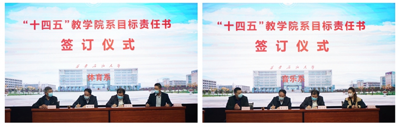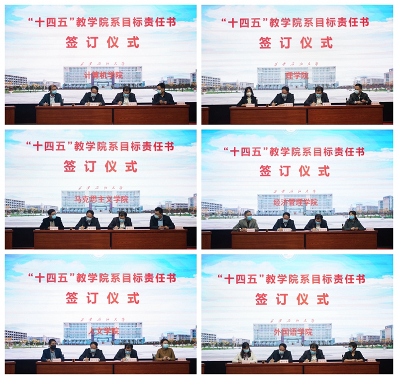 會議首先由校黨委書記賽云秀和校長李天太與各院(系)書記、院長簽訂“十四五”事業(yè)發(fā)展規(guī)劃目標責任書。院系 “十四五”目標責任書從黨建與文化建設、學科專業(yè)、人才培養(yǎng)、師資隊伍、科學研究、合作與交流等不同維度明晰了院系“十四五”建設目標與任務。