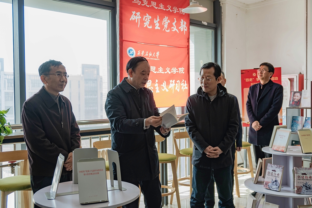 在鄠邑校區(qū),指導(dǎo)組一行參觀了鐵人紀(jì)念館、校史館、馬列書屋“黨史學(xué)習(xí)教育專區(qū)”、實(shí)習(xí)認(rèn)知園、省級(jí)石油石化虛擬仿真實(shí)驗(yàn)教學(xué)示范中心;現(xiàn)場(chǎng)觀摩了我校期刊中心主任郭崗彥講授的“鐵人精神”通識(shí)教育課《破解鐵人之謎,解析精神密碼》第一課堂教學(xué)演示,馬克思主義學(xué)院教師張莉、學(xué)生王婉菲等開(kāi)展的師生聯(lián)學(xué)《從鐵人精神中汲取奮進(jìn)力量》第二課堂教學(xué)演示,以及工程訓(xùn)練中心綜合實(shí)訓(xùn)室開(kāi)展的VR現(xiàn)場(chǎng)教學(xué)演示;實(shí)地察看了“我為師生辦實(shí)事”項(xiàng)目進(jìn)展情況,了解學(xué)校在虛擬仿真實(shí)驗(yàn)教學(xué)與實(shí)踐教學(xué)、體驗(yàn)教學(xué)有機(jī)融合方面作出的互聯(lián)網(wǎng)下教育教學(xué)創(chuàng)新探索成效。在走訪黨史學(xué)習(xí)教育專區(qū)“馬列書屋”時(shí),指導(dǎo)組與我校師生還就基層師生黨支部黨史學(xué)習(xí)教育開(kāi)展情況作了現(xiàn)場(chǎng)交流。