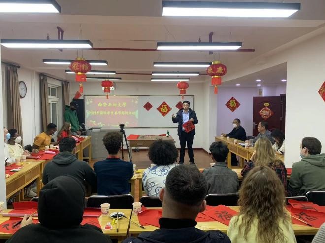 活動中,國際教育學院王朝暉老師用中英雙語和精彩細致的圖文講解為大家介紹了中國春節(jié)習俗,現(xiàn)場寫對聯(lián)、寫“?!弊郑寚H學生通過親手書寫的“?!弊?,感受中國春節(jié)文化習俗,表達新春美好祝福。同學們拿著自己書寫的大大的“?!弊?,送給老師,送給自己的朋友,貼在自己房門上,共迎新年的到來。