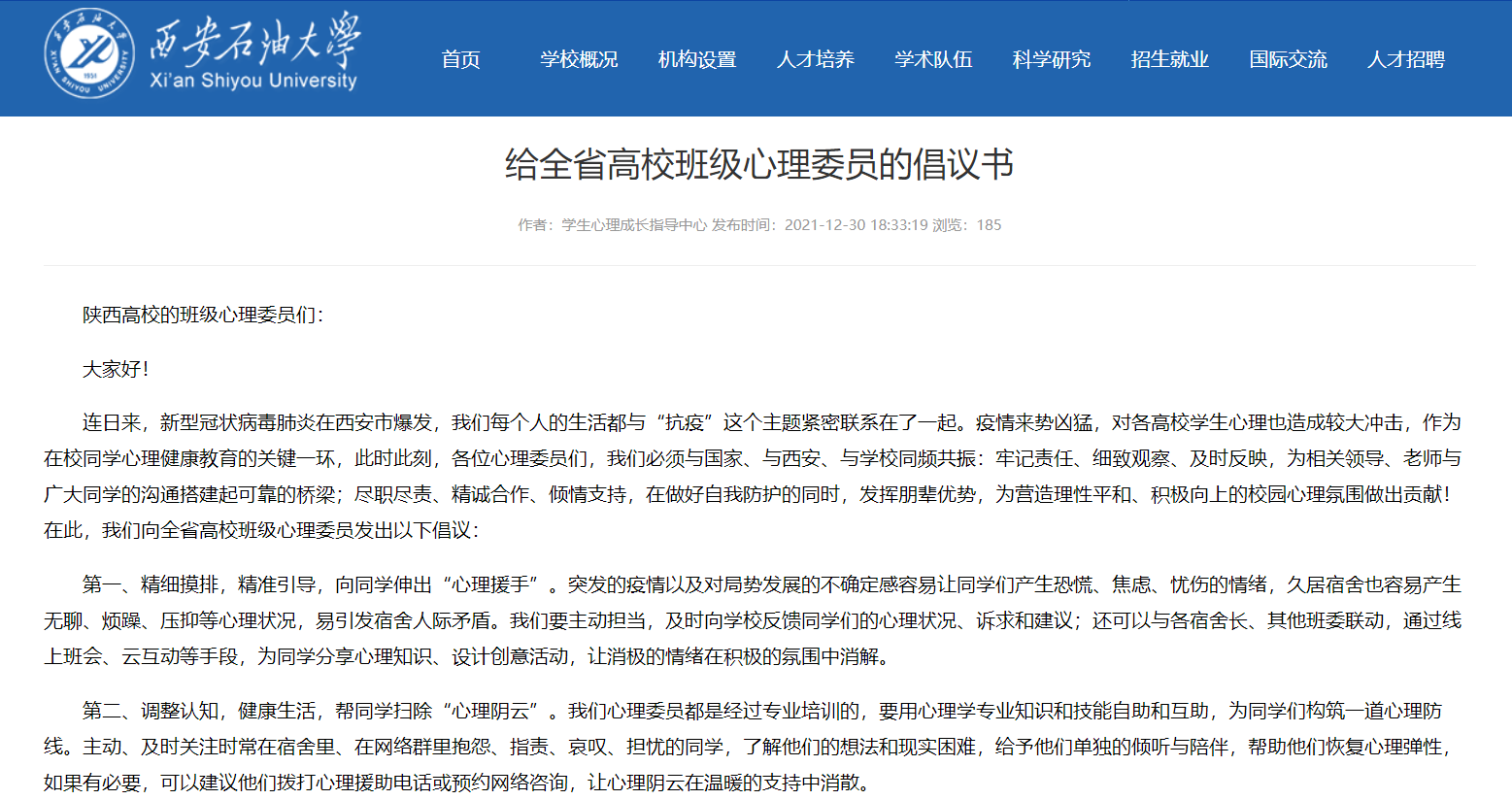 1216日學(xué)校黨委安排部署疫情防控工作以來,黨委學(xué)生工作部、研究生工作部密切聯(lián)動(dòng),各院(系)黨委(總支)積極配合,迅速啟動(dòng)學(xué)生工作干部24小時(shí)在崗、鄠邑校區(qū)每周輪值等工作制度,確保一線工作力量充足,全方位有序做好思想教育引導(dǎo)、政策法律宣傳、衛(wèi)生防疫知識(shí)學(xué)習(xí)等工作。