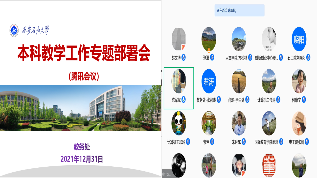 為深入貫徹全省教育系統疫情防控工作視頻會議精神,落實學校疫情防控決策部署和工作要求,全力以赴做好疫情防控期間本科教學工作,保障本科在線教學平穩(wěn)有序運行,2021年12月31日下午,學校疫情防控教學工作組召開了線上本科在線教學工作專題部署會。副校長陳軍斌出席會議,學生工作部(處)、教務處、實驗室管理處、創(chuàng)新創(chuàng)業(yè)中心、高教研究與評估中心負責人以及各院(系)主管教學院長(主任)、教學辦公室主任參加會議。教務處處長張君濤主持會議。