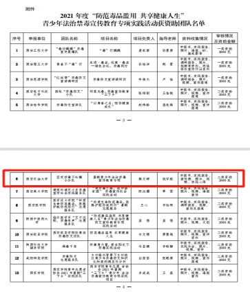 近日,根據(jù)共青團(tuán)陜西省委員會下發(fā)文件《關(guān)于確定2021年度“防范毒品濫用 共享健康人生”青少年法治禁毒宣傳教育專項實(shí)踐活動獲資助團(tuán)隊的通知》,我?!皥远ń静凰尚感》株牎鄙鐣?shí)踐團(tuán)被確定為專項實(shí)踐活動資助項目。