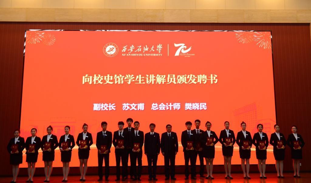 副校長蘇文甫、總會計師樊曉民為17名校史館學(xué)生講解員頒發(fā)聘書。