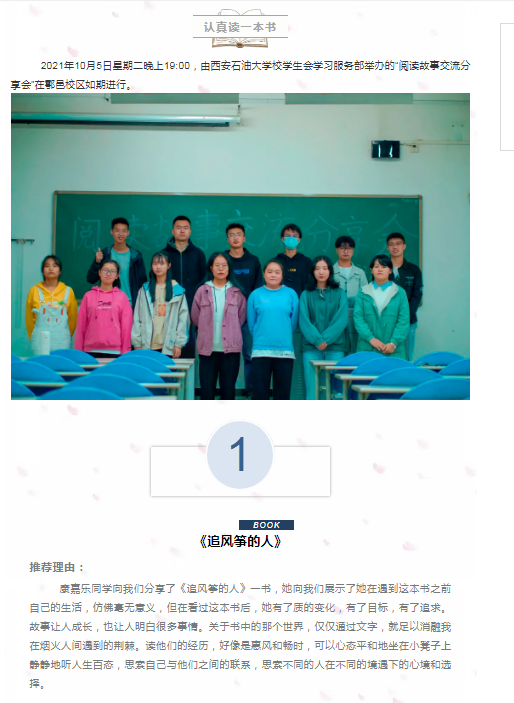 校學(xué)生會微信公共號推送《閱讀,成為一生的功課!——校學(xué)生會閱讀故事交流分享會》,通過對國慶假期開展的“閱讀故事交流分享會”成果進(jìn)行展示,進(jìn)一步倡議廣大青年學(xué)子從經(jīng)典名著中感悟人生哲理,堅定理想信念。