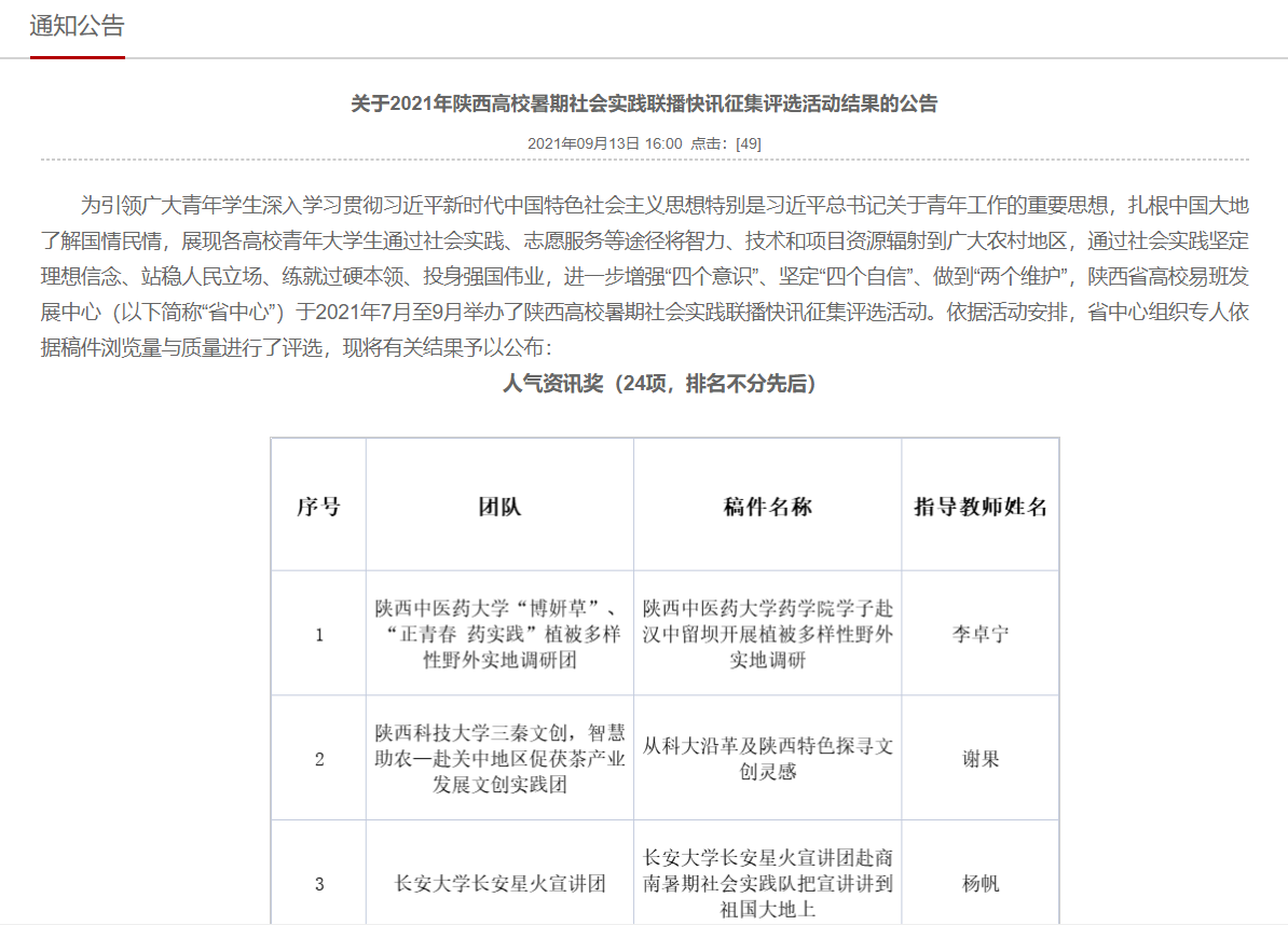 近日,由陜西高校網絡思想政治工作中心組織開展的“關于2021年陜西高校暑期社會實踐聯(lián)播快訊集”評選結果公布,我校材料科學與工程學院“紅色尋訪”社會實踐團隊從全省6752支隊伍中脫穎而出,與其他23支隊伍一同獲得了“人氣資訊獎”,材料類2004王智輝獲得活躍通訊員獎。