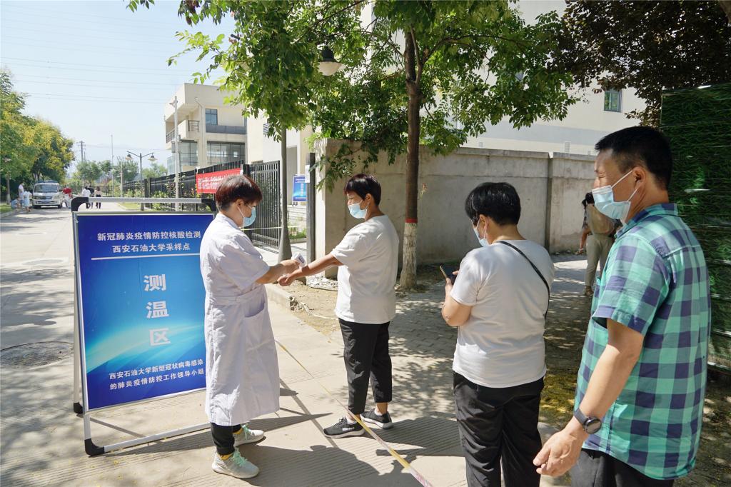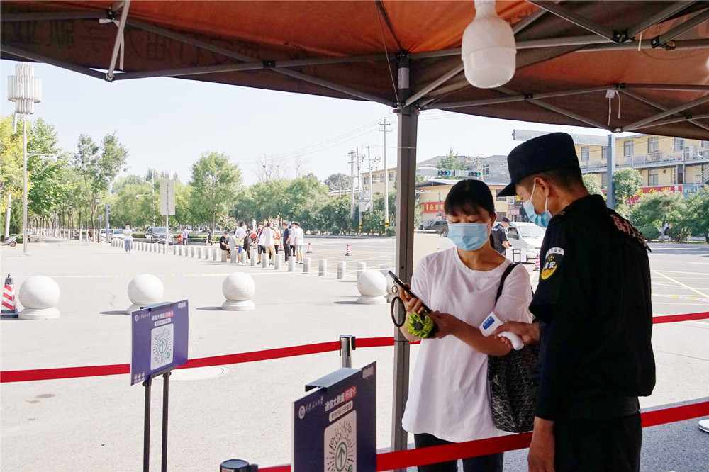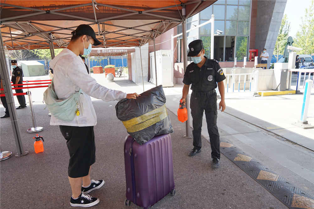 在鄠邑校區(qū)東門演練現(xiàn)場,返校學生按照地面標線,間隔一米有序排隊準備入校,在工作人員引導(dǎo)下間隔1米有序排隊接受進校檢查,經(jīng)過工作人員引導(dǎo)、體溫檢測、身份核驗和健康碼、大數(shù)據(jù)行程碼查驗、行李消毒等程序后有序安全入校。對健康碼顯示“黃碼”或“紅碼”以及體溫出現(xiàn)“異?!钡耐瑢W,工作人員迅速分隔第一現(xiàn)場,疏散周圍人群,將該學生帶至臨時留觀點再次復(fù)核,仍顯示異常者,立即啟動應(yīng)急處置。
