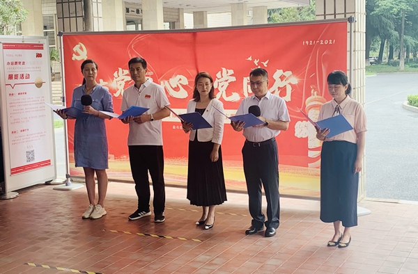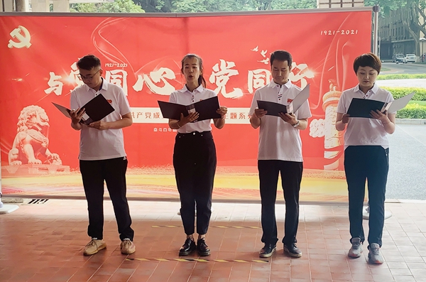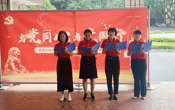 由蔣華義、孟開元、朱瑋、張帆和唐媛芬五位黨員朗誦的詩歌《可愛的中國》,拉開了詩歌朗誦和紅歌獻(xiàn)唱環(huán)節(jié)的序幕。接著參演人員依次登臺,朗誦了詩歌《紅船》和《永在》,演唱了紅歌《唱支山歌給黨聽》和《奮進(jìn)新時代》。飽含深情的朗誦和演唱,帶領(lǐng)大家一起回憶了中國共產(chǎn)黨走過的崢嶸歲月,贊美了中國共產(chǎn)黨帶領(lǐng)中國人民取得的豐碩成果,抒發(fā)了在場黨員對黨對祖國的無限熱愛。