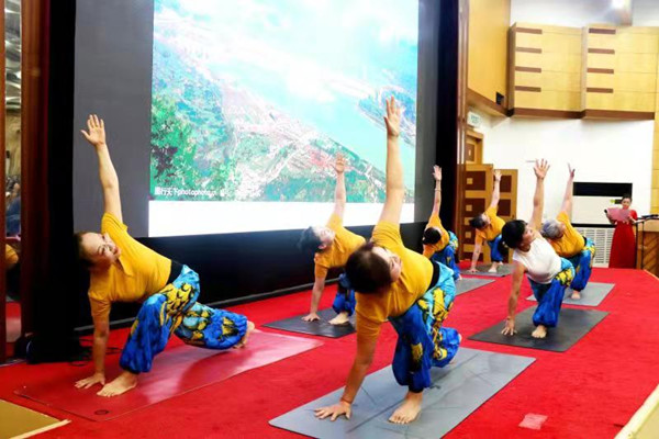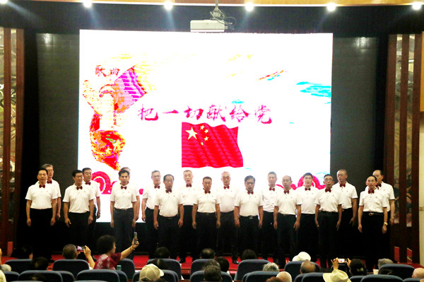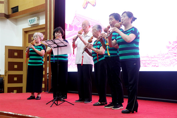 之后,老年大學(xué)的學(xué)員們和離退休教職工為大家?guī)砹司实奈乃嚬?jié)目。演出在開場舞《唱支山歌給黨聽》中拉開了帷幕。老年大學(xué)女子合唱隊(duì)帶來的女聲小合唱《沒有共產(chǎn)黨就沒有新中國》《中國一定強(qiáng)》,合唱團(tuán)男生小合唱《把一切獻(xiàn)給黨》,合唱團(tuán)女生小合唱《洪湖浪花》《天使的聲音》,葫蘆絲樂團(tuán)的聯(lián)奏《紅歌聯(lián)奏》等節(jié)目,充分展示了老年大學(xué)的教學(xué)成果和老同志熱愛黨、熱愛生活的良好精神面貌。黃放明老師京劇清唱《朝霞映在陽澄湖上》,老年大學(xué)瑜伽協(xié)會(huì)帶來的瑜伽表演《人間第一情》、馮原、漢澤西等老同志帶來的詩詞朗誦《人民萬歲》《西石大賦》,展示了離退休教職工的多才多藝。文藝演出最后,我校原校長張寧生教授領(lǐng)唱,老年大學(xué)合唱團(tuán)60多名團(tuán)員共同演唱的《不忘初心》《我家在中國》,將老同志、老黨員對(duì)偉大祖國的熱愛匯集成流淌的歌聲,祝福偉大的祖國繁榮昌盛,祝福偉大的黨永遠(yuǎn)不忘初心,將現(xiàn)場氣氛引向高潮。