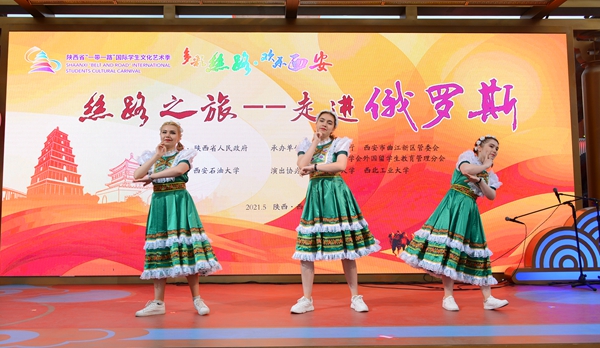 首場演出展示活動(dòng)將俄羅斯作為主題國,由我校牽頭承辦,西安交通大學(xué)、西北工業(yè)大學(xué)協(xié)辦,通過中外學(xué)生服裝走秀、歌曲聯(lián)唱、舞蹈表演、樂器彈奏及現(xiàn)場互動(dòng)等形式,在大唐不夜城步行街展演展示俄羅斯與中國優(yōu)秀傳統(tǒng)文化。我校副校長張榮軍、陜西省教育廳外事處處長文通,以及現(xiàn)場眾多游客觀看演出并參與互動(dòng)。