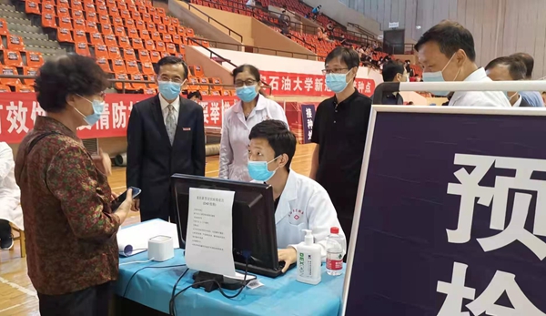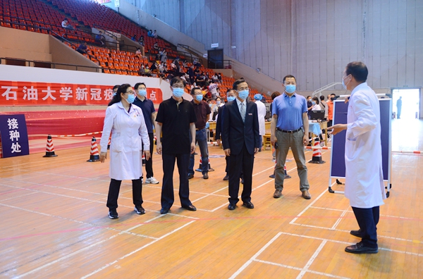 校黨委副書記張木、副校長蘇文甫在疫苗接種現(xiàn)場,聽取了疫苗接種工作有關(guān)情況匯報,詳細詢問了預約接種流程安排,看望慰問正在進行疫苗接種的工作人員和師生。