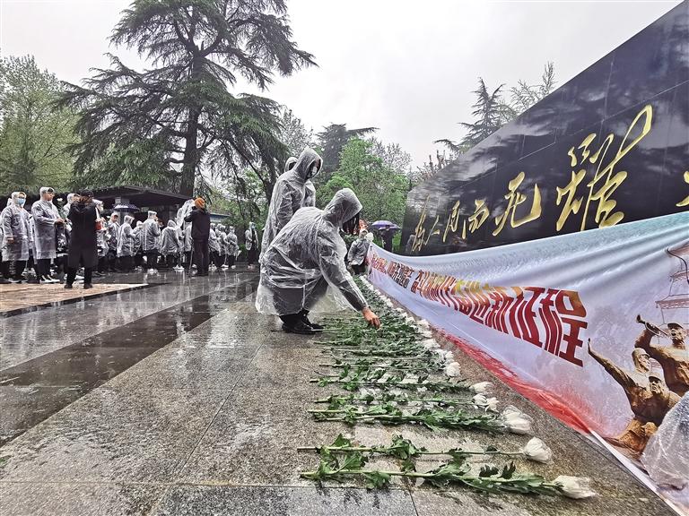 ——4月3日,陜西省“清明祭英烈”活動在西安烈士陵園舉行,西安石油大學30余名師生代表參加了活動。天空飄落著雨滴,“明理增信,崇德力行;興國昌邦,弦歌續(xù)唱”的祭辭在烈士陵園中回蕩。在莊嚴肅穆的氛圍中,參加活動的人們面向烈士紀念墻默哀、行鞠躬禮,并為革命烈士敬獻鮮花。