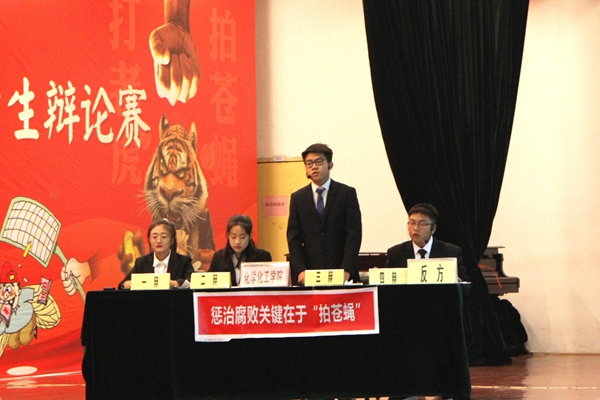 外國語學(xué)院和化學(xué)化工學(xué)院兩支代表隊以“懲治腐敗關(guān)鍵在于‘打老虎’還是‘拍蒼蠅’”為辯題,展開了辯論,唇槍舌劍,精彩紛呈。在場下觀眾提問環(huán)節(jié),在場的同學(xué)們也積極參與了辯論。最終,外國語學(xué)院獲得第二十屆“智者杯”辯論賽冠軍,化學(xué)化工學(xué)院獲得亞軍,石油工程學(xué)院和電子工程學(xué)院獲得季軍。馬克思主義學(xué)院副院長張海濤代表評委團對冠軍爭奪賽作了點評。他談到,在懲治腐敗中,“打老虎”和“拍蒼蠅”同等重要,辯題的設(shè)置體現(xiàn)了唯物史觀視域下堅持“兩點論”和“重點論”的辯證統(tǒng)一,對同學(xué)們深刻理解“不敢腐、不能腐、不想腐”的體制機制建設(shè),牢固樹立廉潔自律意識具有重要意義。