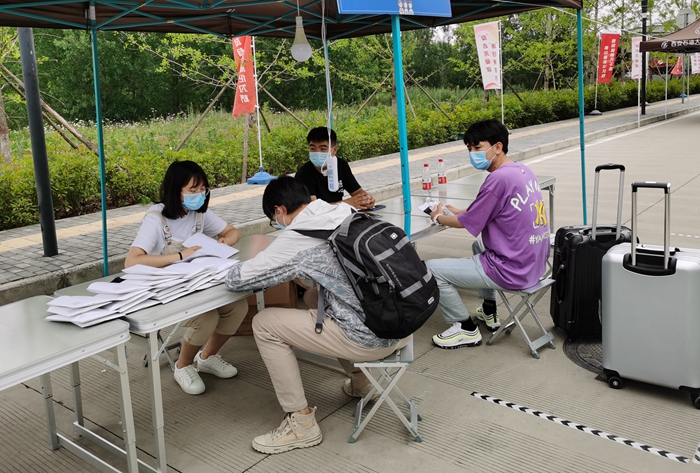 學工部(學生處)干部、各學院副書記、輔導員在接待點堅守,在學生返校后第一時間做好信息登記、教育提醒和溫馨提示,并向學生發(fā)放“防疫愛心禮包”。