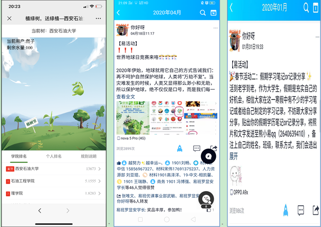 寒假至今,校易班發(fā)展中心累計開展線上活動9次,圍繞防疫教育和中國加油等主題,扎實(shí)開展正能量特色活動。通過開發(fā)易班輕應(yīng)用,獨(dú)創(chuàng)“植樹節(jié)為學(xué)校云植樹”的愛校榮?;顒?,日參與量近千人,截至目前參與總?cè)藬?shù)過萬人。通過此類活動,進(jìn)一步增強(qiáng)了學(xué)生的集體榮譽(yù)感,提升了學(xué)生參與網(wǎng)絡(luò)思政活動的主動性,也為我校今后持續(xù)開展網(wǎng)絡(luò)思政育人工作積累了寶貴經(jīng)驗(yàn)。