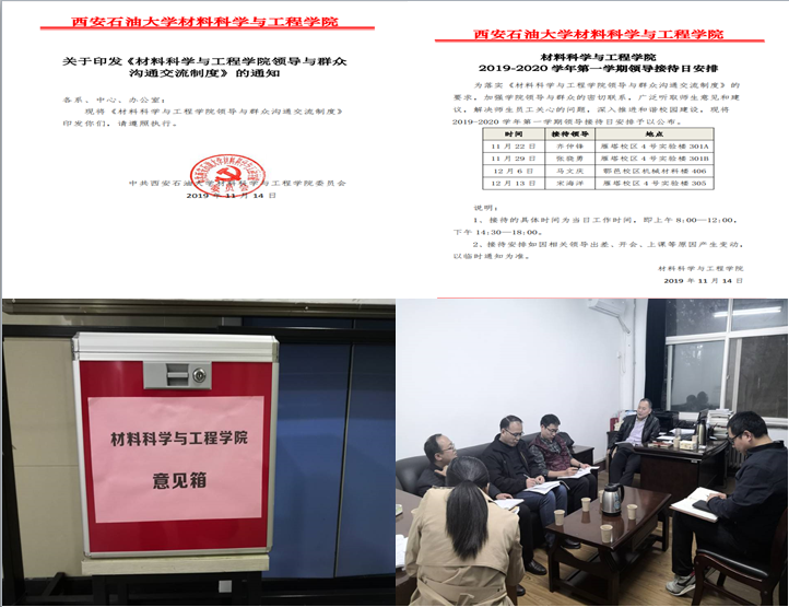 構(gòu)建溝通交流機(jī)制。出臺《材料科學(xué)與工程學(xué)院領(lǐng)導(dǎo)與群眾溝通制度》,對學(xué)院領(lǐng)導(dǎo)深入一線提出了明確要求,設(shè)立院領(lǐng)導(dǎo)每周定期接待日,在兩個校區(qū)放置了學(xué)院意見箱。