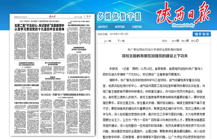 11月13日的《陜西日?qǐng)?bào)》3版,以《張廣智在西安石油大學(xué)調(diào)研主題教育時(shí)強(qiáng)調(diào):高校主題教育要在加強(qiáng)黨的建設(shè)上下功夫》為題進(jìn)行了報(bào)道。文章談到,張廣智先后來到地球科學(xué)與工程學(xué)院、油氣成藏地質(zhì)學(xué)重點(diǎn)實(shí)驗(yàn)室、地質(zhì)實(shí)驗(yàn)檢測(cè)分析中心、油氣鉆井國(guó)家工程實(shí)驗(yàn)室和管網(wǎng)仿真綜合實(shí)驗(yàn)室,詳細(xì)了解主題教育開展和科研情況,聽取意見建議,并與部分黨員代表座談。他指出,高校是立德樹人的地方,抓好主題教育具有更加特殊而重要的意義。要牢牢把握總要求,緊扣主題主線,抓住重點(diǎn)關(guān)鍵,搞好結(jié)合融合,確保主題教育不偏不虛不空。要把加強(qiáng)黨的建設(shè)作為重要任務(wù),聚焦堅(jiān)持正確辦學(xué)方向、落實(shí)立德樹人根本任務(wù),深入檢視整改思想政治課、意識(shí)形態(tài)工作等方面的問題,大力培養(yǎng)愛黨愛國(guó)愛社會(huì)主義、立志為“兩個(gè)一百年”奮斗目標(biāo)奮斗終身的優(yōu)秀人才。要聚焦加強(qiáng)基層黨組織建設(shè),深入檢視整改一些黨組織軟弱渙散、黨員先鋒模范作用發(fā)揮不充分的問題,推動(dòng)基層黨組織全面提升、全面過硬。要聚焦師生最急最憂最盼,深入檢視整改教學(xué)科研、日常管理、服務(wù)保障等方面的問題,讓廣大師生切實(shí)感受到組織的溫暖,不斷增強(qiáng)“四個(gè)意識(shí)”、做到“兩個(gè)維護(hù)”,自覺聽黨話、堅(jiān)決跟黨走。要聚焦“雙一流”建設(shè),深入檢視整改學(xué)科建設(shè)、人才培養(yǎng)使用等方面的問題,著力提升辦學(xué)質(zhì)量、多出人才,更好服務(wù)新時(shí)代追趕超越和高質(zhì)量發(fā)展。