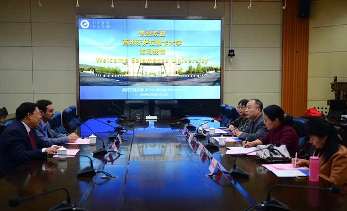 陳軍斌副校長對何塞·米格爾先生一行來訪表示歡迎,并介紹了學校的發(fā)展歷史和基本情況。他談到,為滿足中石油、中石化等企業(yè)在海外開展業(yè)務的需求,我校從1997年就開展了西班牙語的培訓工作。隨著中國改革開放的深入和“一帶一路”倡議的實施,大批中國石油石化企業(yè)在南美西班牙語國家拓展業(yè)務,急需大量西班牙語人才。我校是中國西北地區(qū)唯一一所以石油石化為特色的高等學校,在我校成立薩拉曼卡大學西班牙語學院具有重要意義,可以培養(yǎng)既懂專業(yè)技術又通曉西班牙語的復合型人才,服務于國家經濟發(fā)展的需要和“一帶一路”倡議需求。他希望兩校以此為平臺開展全方位的合作,不僅僅局限于語言培訓,還要積極開展西班牙語及西班牙文化的研究,提升我校與西班牙教育合作交流的水平。