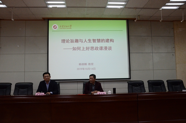 聘任儀式結(jié)束后,賴雄麟教授為馬院師生作了題為《理論旨趣與人生智慧的建構(gòu)——如何上好思政課漫談》的學(xué)術(shù)報告。他從我們?yōu)槭裁葱枰枷胝谓逃?、思想政治教育的性質(zhì)、如何上好思想政治教育三個方面進行了精彩地講解,并與參會師生進行了互動交流。